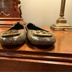 Tory Burch Gold Snakeskin Embossed Leather Reva Logo Ballerina Flats Size 9.5