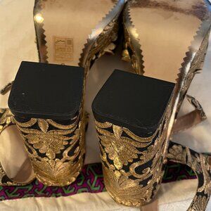 Tory Burch Gold/Black Brocade Fabric Loretta Platform Heels Size 11
