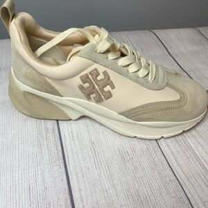 Brand new in box and never worn! These Tory Burch Good Luck Trainers are a sleek mix of sporty and chic, in the French Pearl/Dulce De Leche/Biscotti colorway (style 83833). They feature the signature sculpted sole and subtle Tory Burch logo details, and come with an extra set of laces.