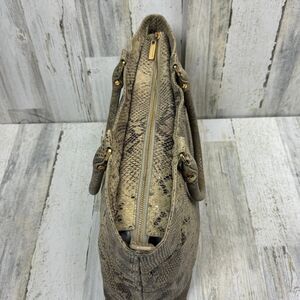 Taupe embossed snakeskin printed leather. Gold tone hardware. Zip closure. Slip & zip pockets inside.