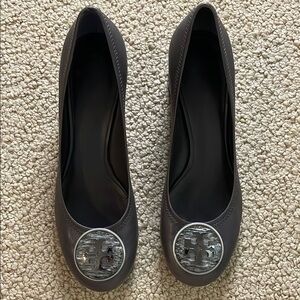 Step out in style with these elegant Tory Burch gray shoes. Perfect for any occasion, these shoes offer both style and sophistication. Neutral medium gray with wood block heel. Silver logo with gray marble design. Very unique and chic. Excellent used condition. Slight scuff on one toe and threading is loose on one shoe - see photos.