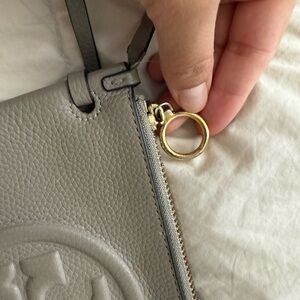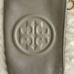 Preowned Tory Burch Gray Wristlet Clutch. Please see all pictures- signs of wear but it’s in good preowned condition.