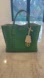 Elegant green tote by Tory Burch. Features cream details and iconic logo charm. Ideal for stylish outings.