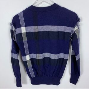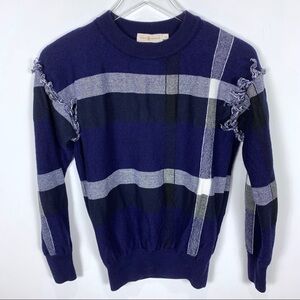 Tory Burch Gwen Plaid fringe wool sweater. This plaid Tory Burch sweater is detailed with soft fringe at the dropped shoulder seams. Banded edges. Long sleeves. In excellent condition. Size small.