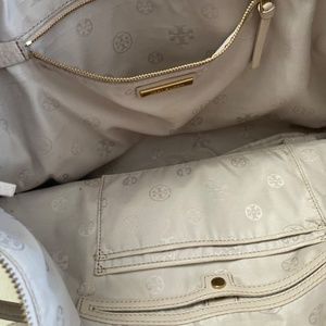 Beautiful blush taupe color Tory Burch Handbag . Pre owned in good condition, a small mark on front lower side of bag ( see picture) interior stain free , approx 18 inches wide , approx 12 inches tall , slouch bag with strap and duster bag .