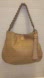 Chic Tory Burch hobo bag in camel leather. Features braided handle and tassel detail. Iconic logo accent. Some wear in the bottom and pen mark inside.