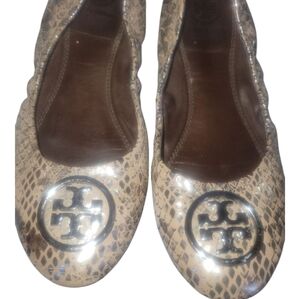 Tory Burch Heidi Reptile Mettalic Snakeskin Silver/Tan/ Ballet Flats 6 1/2