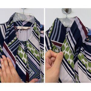 This Tory Burch Homage to the Flower Silk Shirt is in good condition. This blouse features a floral patchwork stripe print. Silk, bow tie neck, long sleeves, button down shirt style. There is noticeable wear and fading throughout; there is some wrinkling on the seams. There is fabric stretching on/near the sleeves, and there is a small mark near a back armhole.