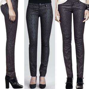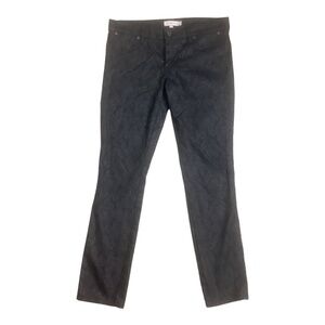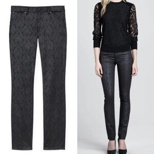 Printed with a tonal floral lattice motif elevating this basic black pair to evening-worthy territory. Slim fit from waist to ankle with the perfect amount of stretch for an amazing fit. Button/zip front with belt loops. Buttons and rivots have signature Tory Burch logo.Great pre-owned condition, no visible flaws!