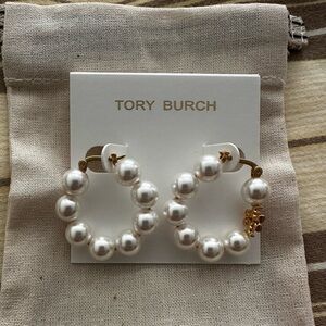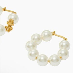 NWT-Tory Burch Kira hoop earrings featuring a radiant white faux pearls, These earrings are accented with the label's signature Serif-T logo at the face.