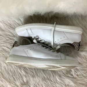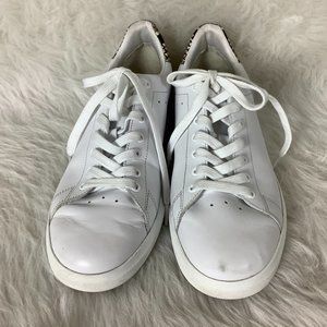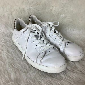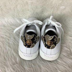 This is a pair of white leather, snakeskin embossed heel, gold tone logo, low top sneaker from Tory Burch. A little wear on foot beds and soles, light vamp creasing, marks on toes. Athleisure, casual, normcore.