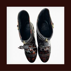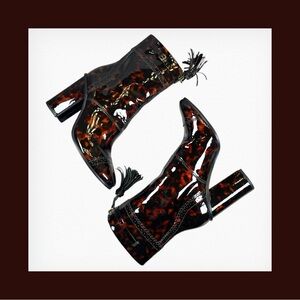 👉🏻 Made of tortoise-print patent leather that feels spot-on yet unexpected, with brogue-like trim and a buckled strap at the top with a tassel.
