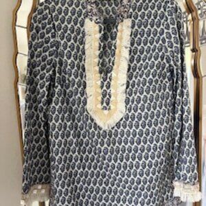 Beautiful style, and incredible quality. Made in India, this tunic is special. The shell, raffia and fringe detail on the chest and wrists are beautiful. The fabric is 100% cotton, the length is 29", and there is a side zipper for easy access. The split side hem had complimentary/contrasting fabric for additional style. In great condition.