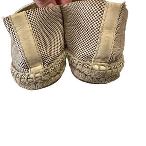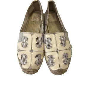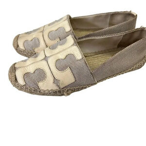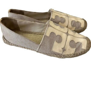 Tory Burch Ines Canvas Espadrille Flat 10 Ivory/Brown Leather T Logo Slip On