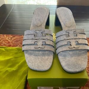 Tory Burch Ines Heel Mule Sandal 55MM Denim Suede in Blue Cloud Sz 9, BNIB,