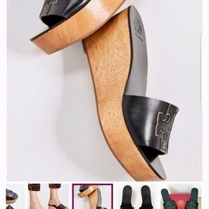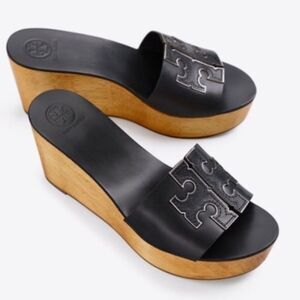 Tory Burch Ines Wedge Slides Calf Leather Metallic Perfect Black Sandals size 9