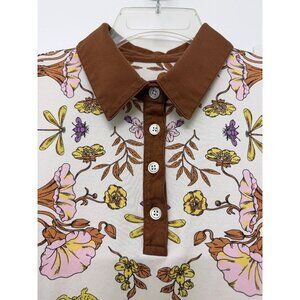 This Tory Burch Mercerized Printed Polo T Shirt is in good condition. Features the Ivory Rabbit Field print--a rabbit / bunny / animal floral print with a brown collar. Cotton, collared, short sleeves. There is wear and fading on the collar. There is minor wear on the rest of the shirt. There is a tiny speck on the back.