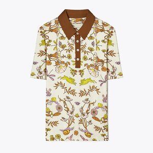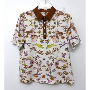 Tory Burch Ivory Rabbit Field Printed Mercerized Polo T Shirt Floral Bunny M