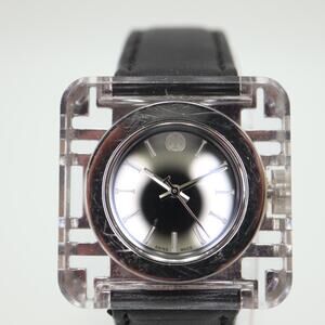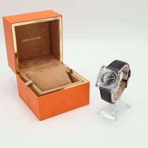 Tory Burch Izzie Watch Clear Silver 36mm Case Black Genuine Leather Strap In Box