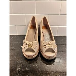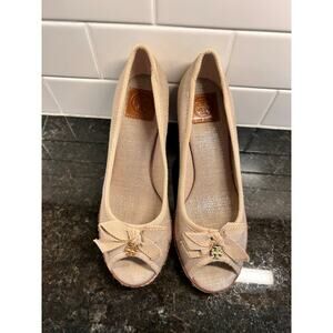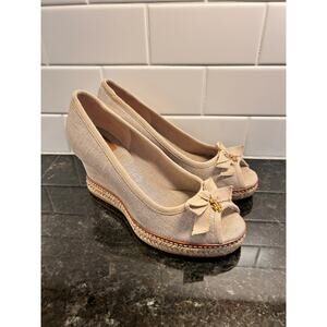 Tory Burch Jackie Canvas Natural Peep-Toe Espadrille Wedges Metallic sheen 7.5