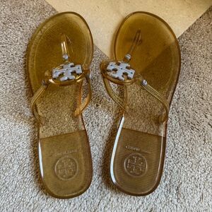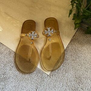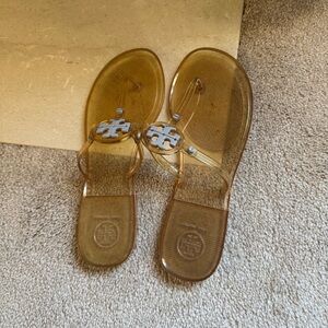 Clear jelly sandals with Tory Burch logo. Perfect for casual wear.