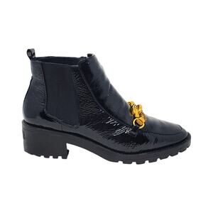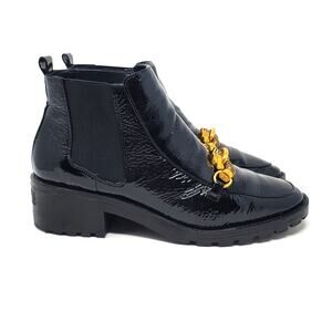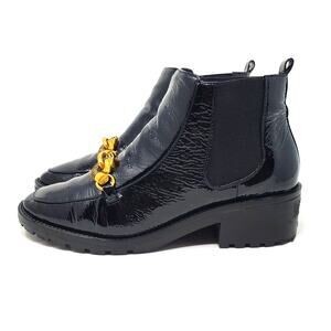 Our must-have Jessa, as a new Chelsea boot. Made of patent leather with exaggerated chain-link hardware, it's finished with a sporty lug sole. Wear it with everything from cropped pants to dresses.