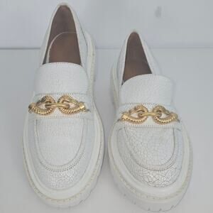 Tory Burch Jessa Lug Sole Loafer White Crackle Gold Tone Metal Horse Head Size 7