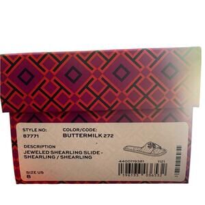 Slide into the cozy Tory Burch Jeweled Shearling Slides. Shearling upper. Shearling lining. Cushioned insole. Foam footbed. Round toe. Jeweled double T. Slip-on style closure. Rubber outsole. Real Lamb's shearling fur, dyed, from Spain.