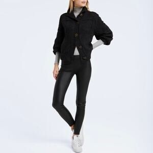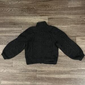 Cozy and chic Tory Burch “Jillian” chunky cardigan sweater in a deep charcoal gray. Features oversized tortoiseshell buttons, a mock neck collar, and balloon-style sleeves for a modern silhouette. Crafted in a warm wool blend with ribbed trim for structure. A versatile layering piece that adds polish to both casual and elevated outfits.