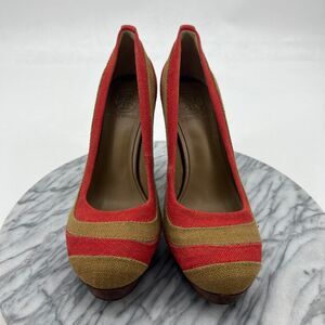 Tory Burch Joelle Platform Pump Womens 8 Linen Patchwork Wood Heel Round Toe