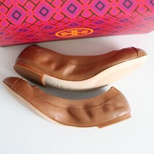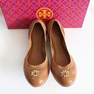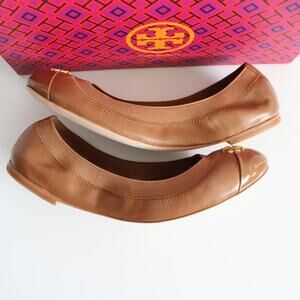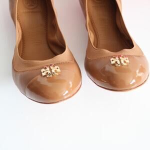 Tory Burch Jolie Tan Brown Nappa & Patent Leather Cap Toe Ballet Flat