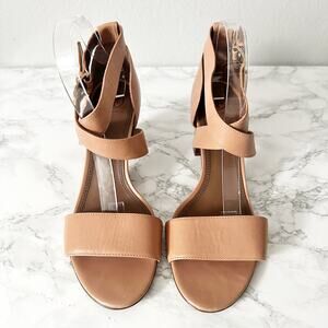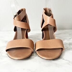 Nude/tan leather crisscross ankle strap sandal with curved block heel and Goldtone metal logo engraved indent/cut out at heel