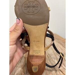 These are a pair of authentic, gently used Tory Burch Kailey two-tone Bow Sandals with Tory Beige vegan leather, black patent leather slingback straps, and gold hardware featuring the signature Double-T medallions.