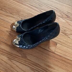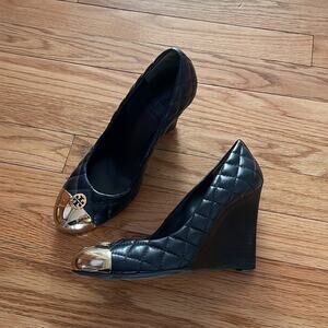 Tory Burch Kaitlin black quilted monogram gold cap toe leather wedges size 7