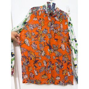 Tory Burch Kia Orange Garden Print Silk Shirt Top Green Floral Tie Neck 8