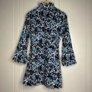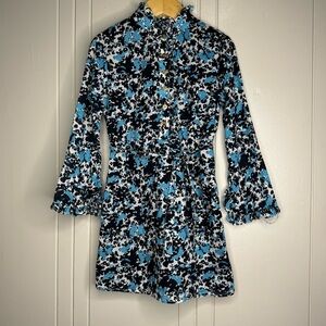 Casual dress with a striking blue and black pattern. Perfect for any occasion. tie back adjustable waist with adorable details in the print as well as i. the design of the dress from shiny logo gold buttons to split ruffle sleeves