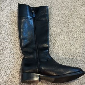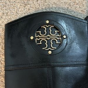 Tory Burch Kiernan 35MM Leather Riding Boot, size 8. Black with gold hardware. Signature Tory Logo outside via hardware in inside via tapestry lining. 1” stacked heel. Interior full zipper. Excellent condition and worn minimally.