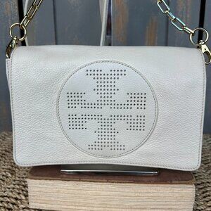 Tory Burch Kipp Perforated Logo Foldover Clutch Crossbody Bag White