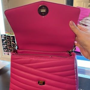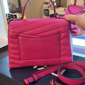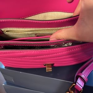 Tory Burch Kira top handle flap bag. Crazy pink. This is a soft leather therefore, the corners show minimal signs of normal wear (as “normal” as a color such as this can be). Color is no longer available. The bag is just gorgeous but I haven’t reached for it in a while. I’m trying to downsize my home closet. Can be worn as a shoulder bag, crossbody or worn on the arm or in hand.