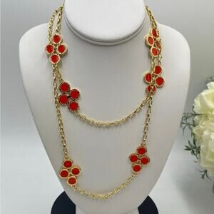The Tory Burch reddish and Gold Long Rope Chain Necklace is a stylish statement piece perfect for adding a pop of color to any outfit. The necklace features a vibrant orange red color set against a backdrop of yellow gold plated metal, creating a bold and eye-catching look.