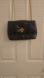 Chic black leather bag with quilted design. Features a gold-tone chain strap and iconic logo. Perfect for stylish outings.