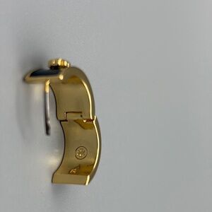These Tory Burch earrings showcase a stunning blend of gold-tone metal and black enamel, highlighted by the iconic logo design. The elegant contrast between the gold framing and the black center band adds a touch of sophistication to these hoop-style earrings, making them a timeless accessory.