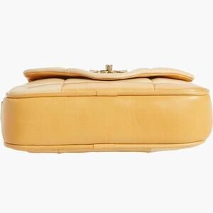 Stacked-T logo hardware gleams on a compact camera bag featuring a leather patchwork design and an adjustable chain-and-leather crossbody strap.