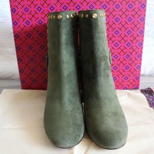 Tory Burch Kira Olive Green Suede Gold Stud Logo Ankle Bootie