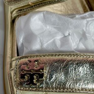 Gold Brand new Tory Burch Sandal with shoe box and cloth included. the heel is one inch with adjustable hook and loop top straps. shoe is made from leather with rubber soles. the contoured platform gives the shoes a sporty look with Tory Burch logo hardware on it