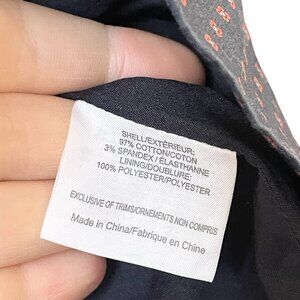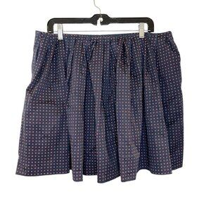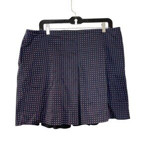 Tory Burch Klarissa Pleated Mini Skirt in size 14, featuring a navy blue geometric pattern with a schoolgirl style. Made from a cotton blend material with pleated accents, this skirt is designed for casual occasions and has a zip closure. It is adorned with pockets, suitable for all seasons, and must be dry cleaned only.