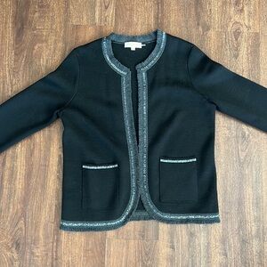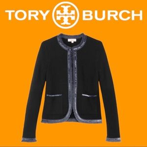 In good condition verify pictures for description gorgeous Tory Burch jacket-like cardigan. Beautiful bead work but could still be suitable for daytime. 100% merino wool.