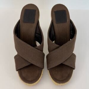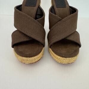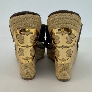 Tory Burch Kristen Canvas Platform Wedge Espadrilles Heels Gold Logo Brown 9M