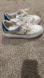 Stylish white sneakers featuring mermaid blue accents and iridescent details. Perfect for casual wear. Will come with box but no dust covers.