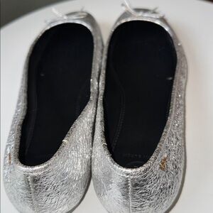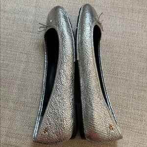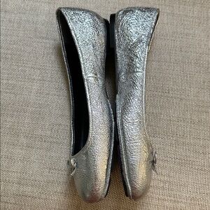 Tory Burch Laila 2 Driver Leather Ballet Flats Crinkle Metallic Silver Flaw